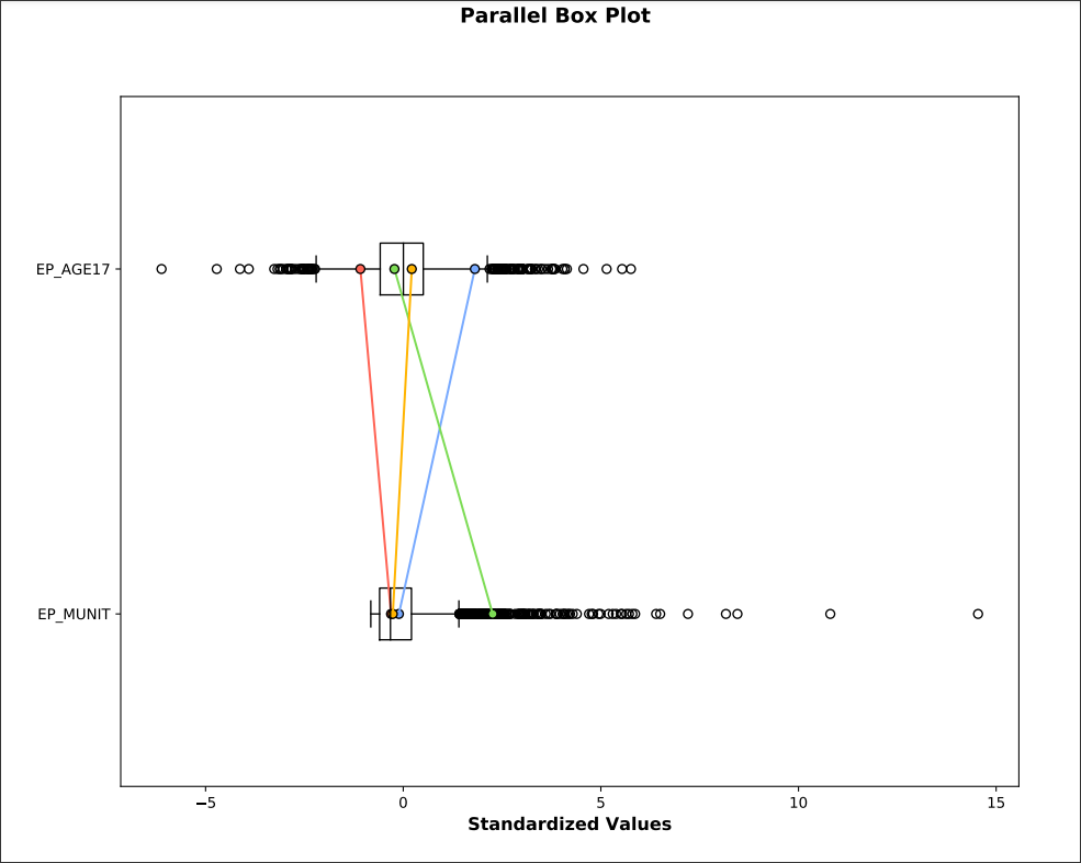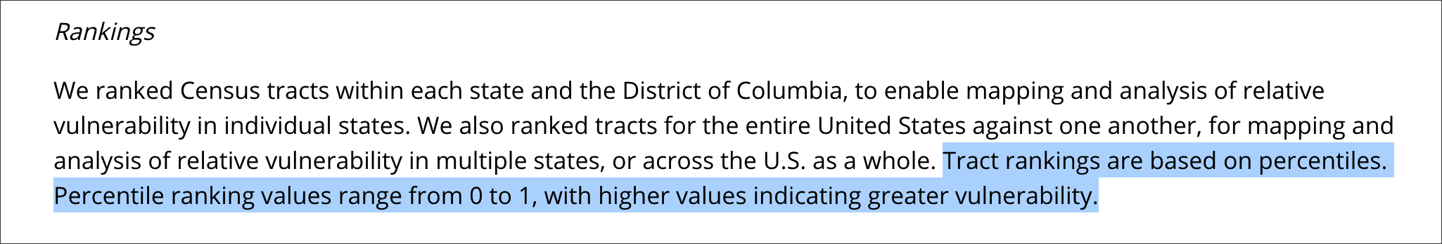 As discussed in the 2020 CDC SOVI Model documentation, the dataset’s theme structure is scored based on a percentile rank. Percentile scoring highlights the ‘below’ values for any percentile position within the dataset.
