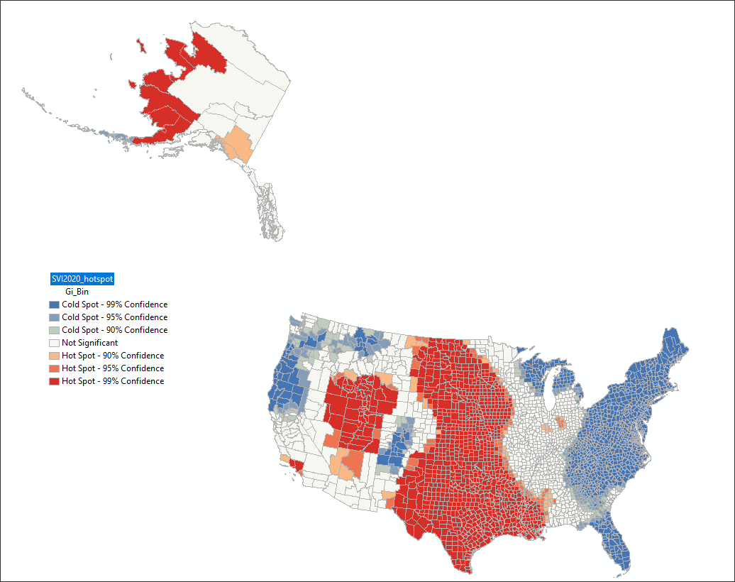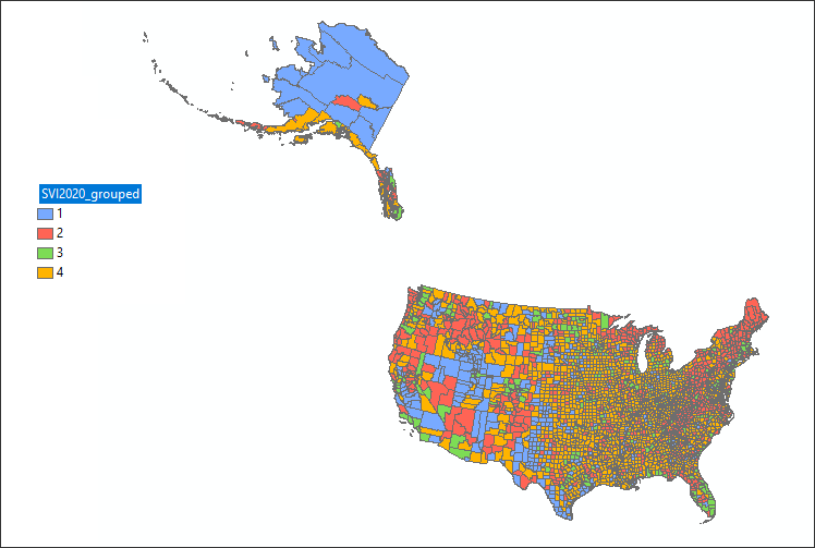 The direct download of the CDC SVI dataset has been reprojected to an equidistant projected coordinate system (USA_Contiguous_Equidistant_Conic) in order to run distance-based statistical tests in this demonstration lab.