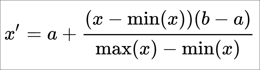 The Min - Max Normalization can also be performed for a custom range, i.e. 1 > 10 as opposed to 0 > 1 as we have done thus far. The formula for this normalization is as follows: