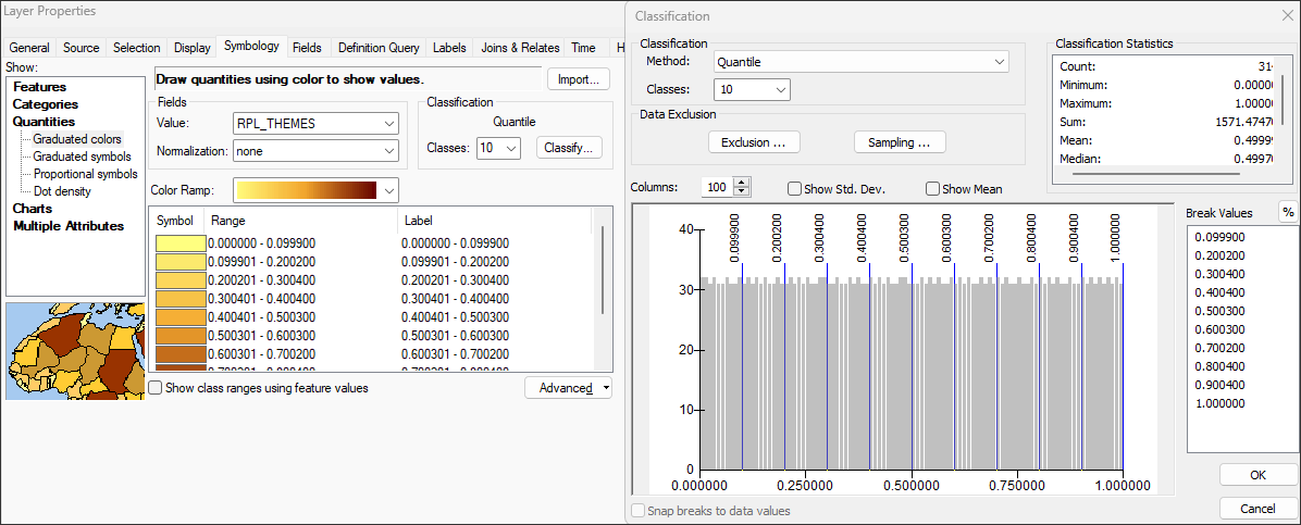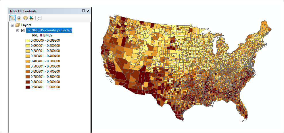 With ArcCatalog open and pointed to the datasource SVI2020_US_COUNTY, first map on RPL_THEMES and explore the percentile approach in the mapping: