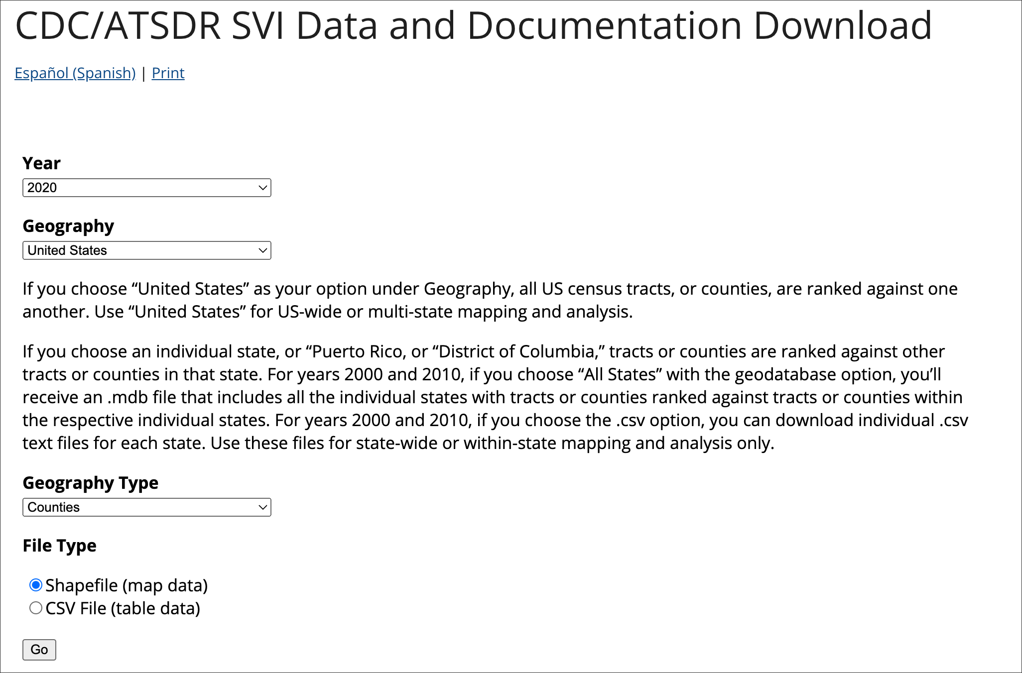 To start, we will access the latest 2020 SVI dataset for US Counties: