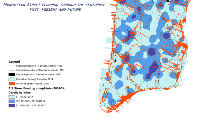 Street flooding is an escalating issue in New York City, causing significant disruptions and posing risks to infrastructure and public safety. This study investigates the historical, present, and projected future street flooding on Manhattan Island to understand its ecological impact and inform future urban resilience strategies. By utilizing historical data from the Welikia Project, current 311 flood complaints, and future flood projections from the NYC Stormwater Flood Map, this research provides a comprehensive analysis of flooding patterns. The methodology involved overlaying Manhattan's historical shorelines and water bodies with present-day 311 flood complaints and future street flooding predictions. My results indicate a strong correlation between present flood complaints and projected future flood zones, revealing that areas prone to flooding today often coincide with historical water bodies and are likely to experience increased flooding in the future. This highlights the need for improved infrastructure and proactive planning to mitigate future flood risks, drawing from historical insights to address contemporary challenges.
