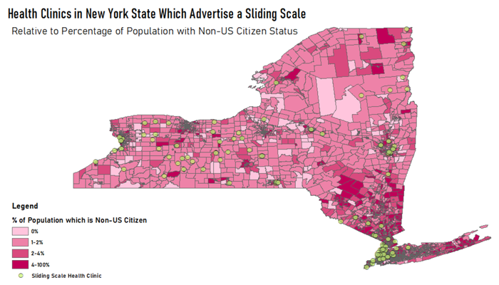 I produced this map to approach an issue of data organization that has presented itself to me over the last year. New York State has a rising immigrant population, which means a rising demand for social and health needs. I’ve witnessed the value of clinics which offer a sliding scale program as they have helped non-US citizens in my life afford essential medical procedures. For this reason I aimed to create a map to highlight the proximity of clinics which are, in theory, affordable, to populations that are most in need of them. The challenge is that there is no centralized list of clinics which offer this, and there seems to be somewhat of a gray area when it comes to finding a clinic near you that you can afford.