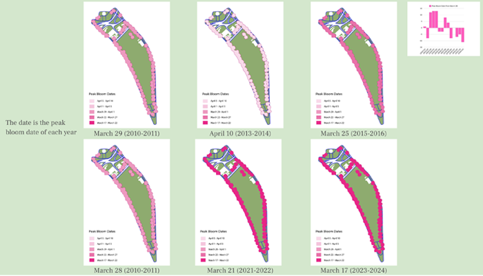 For my GIS final project I am going to map how the blooming season of cherry blossoms in Washington DC is getting earlier due to climate change. This project is related to my thesis project which is about using nature’s healing properties for treating mental health. I want to show the relationship between climate, geography, and ecology. These maps can help identify how the peak bloom date has changed even in the past decade, to warn about this trend continuing in the future. The organizations that can be connected to this project are the National Park Service and the Environmental Protection Agency (EPA). My capstone project for my studio right now is incorporating gardening and farming, so this connects to something I’m currently working on. I plan to show maps illustrating the peak bloom date over the past decade in Washington DC.